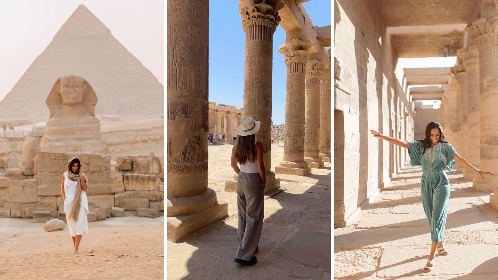 A nap Egyiptomban erősebb, mint itthon. Egy széles karimájú kalap, napszemüveg és magas faktorszámú naptej nemcsak komfortot ad, hanem hosszú távon is védi a bőrt. Egy könnyű kendő a por ellen is jól jöhet, különösen kirándulások során.